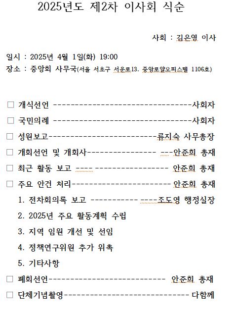 한민족통일여성협의회(총재)는 지난 4월 1일 2025년도 제2차 이사회를 개최했습니다. 중앙회 사무국에서 개최된 이날 오후 7시부터 진행된 회의에서는 대의원 정기총회를 비롯하여 2025년도 1/4분기에 추진한 활동사항(주요행사 등)을 보고한데 이어 향후 추진할 활동계획을 논의, 의결했습니다. 자세한 내용은 아래와 같습니다. <사무국 올림>