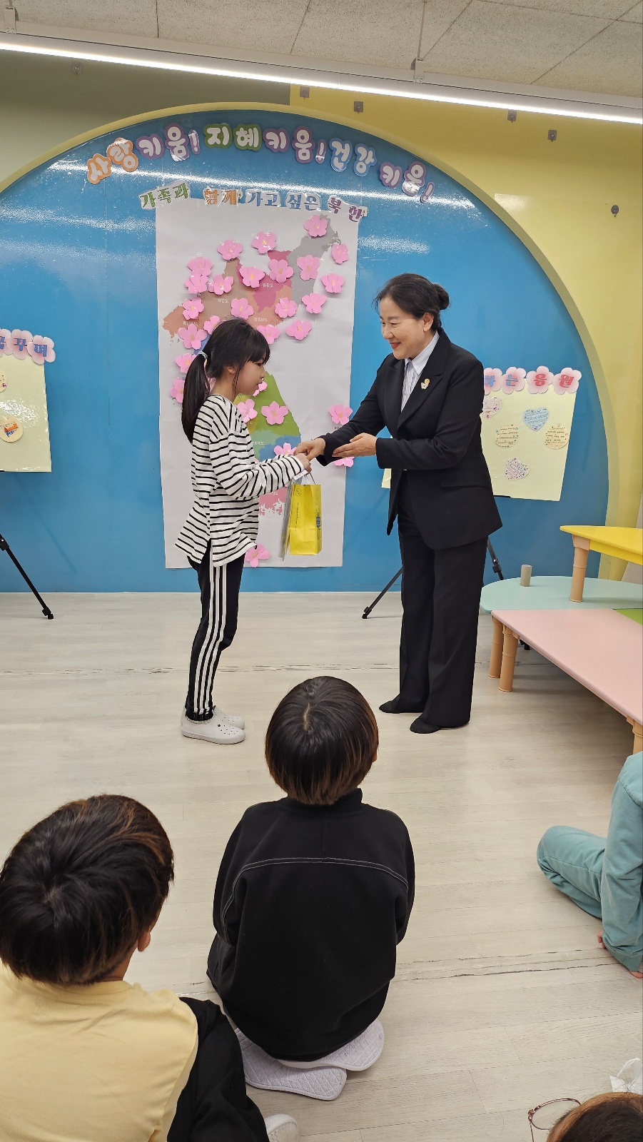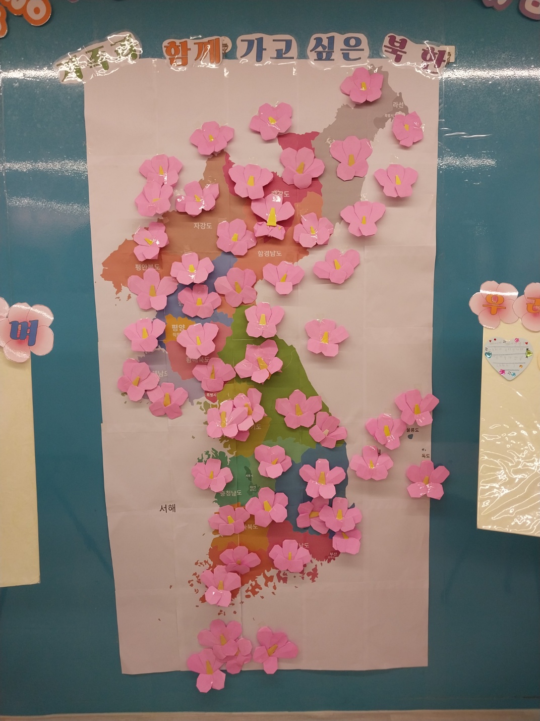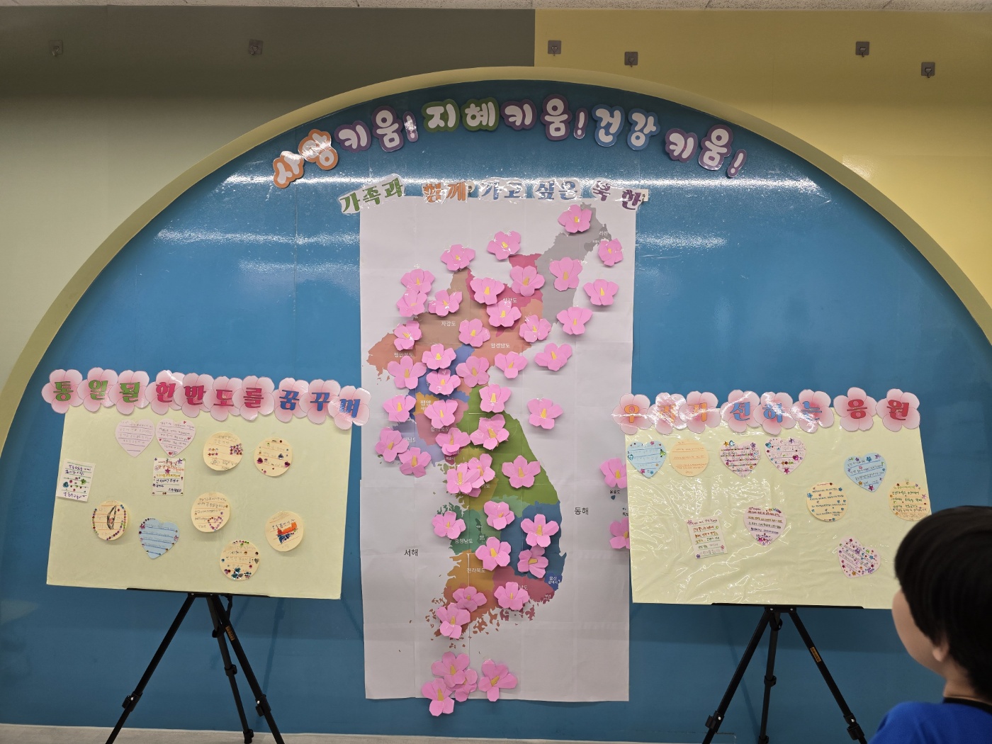 □ 참여 학생들은 한통여협이 제작한 홍보영상 시청에 이어 그램책을 통한 분단의 역사 이해하기, 한반도지도에 색칠하기, 북한친구에게 편지쓰기 등을 했습니다. 또한 대형 한반도지도를 설치하여 손수 접은 무궁화를 가보고 싶은 지역에 붙이기 등 쉽고 흥미로운 놀이체험을 통하여 나라사랑의 의미를 알고 통일에 대한 이해와 관심을 갖도록 했습니다.