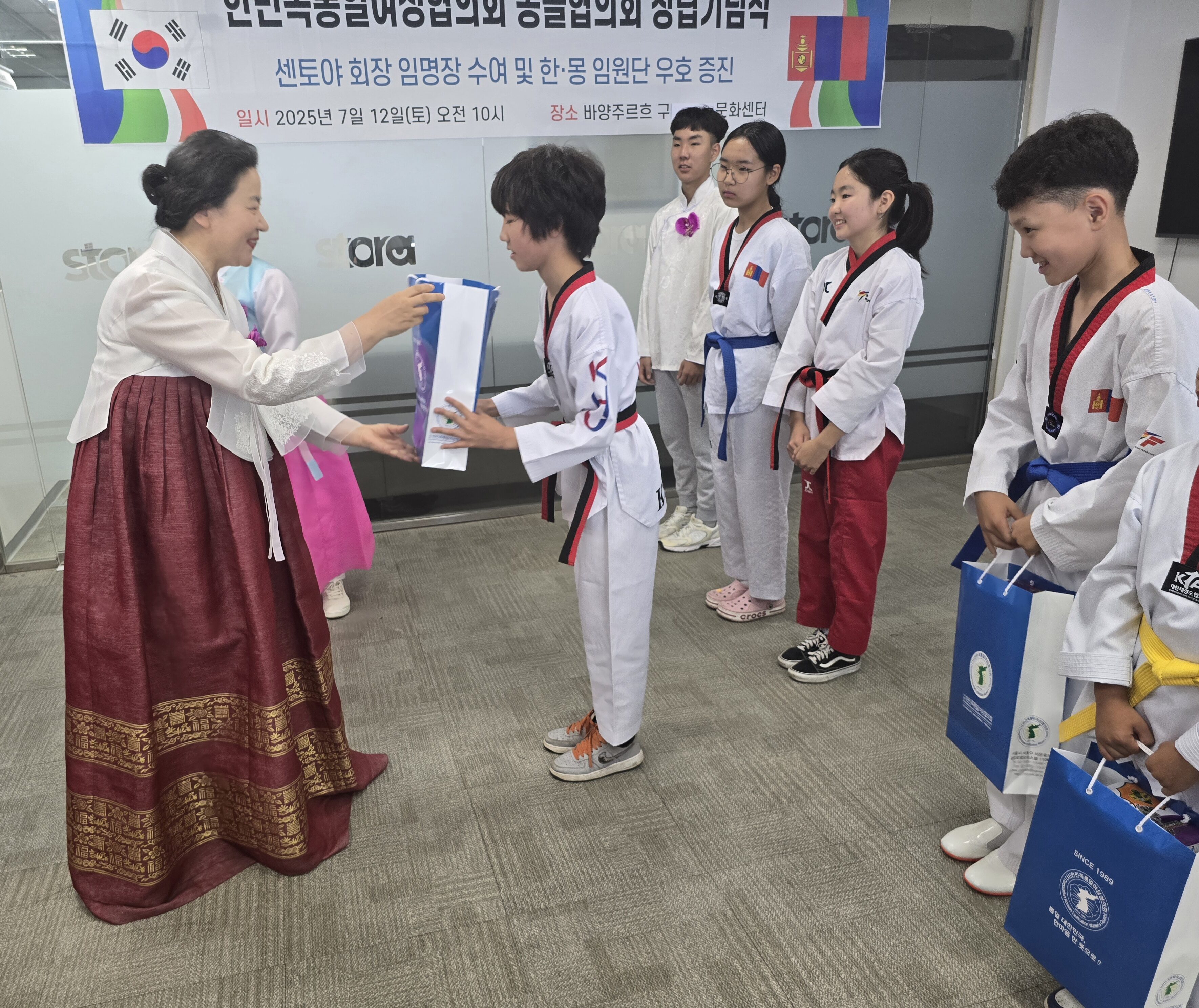 □ 이날 창립식에는 현지에서 운영 중인 경희태권도클럽(관장 : 이창용) 소속 몽골어린이들의 태권도시범과 센토야 회장 가족의 전통악기 연주로 축하분위기를 고조시켰습니다. 중앙회 측은 이들을 포함한 창립식 참석자 전원에게 기념품을 전달하고 향후 몽골협의회 활동에 관심과 참여를 부탁했습니다.